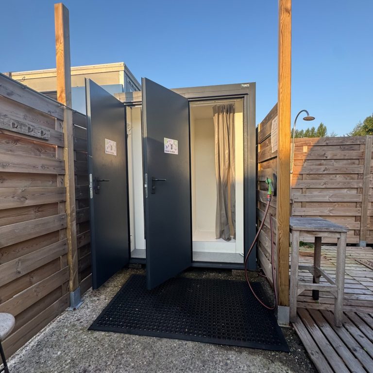 2 Douchecabines met warme douches + een koude buitendouche.