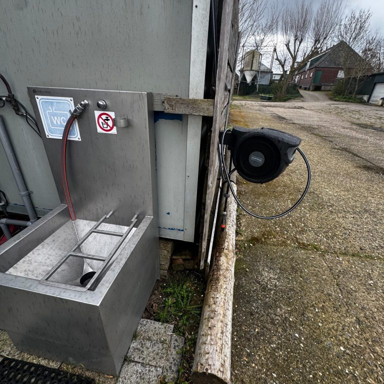 2 watertappunten met leidingwater, grijswater afvoerput en stortbak voor toiletcassette.